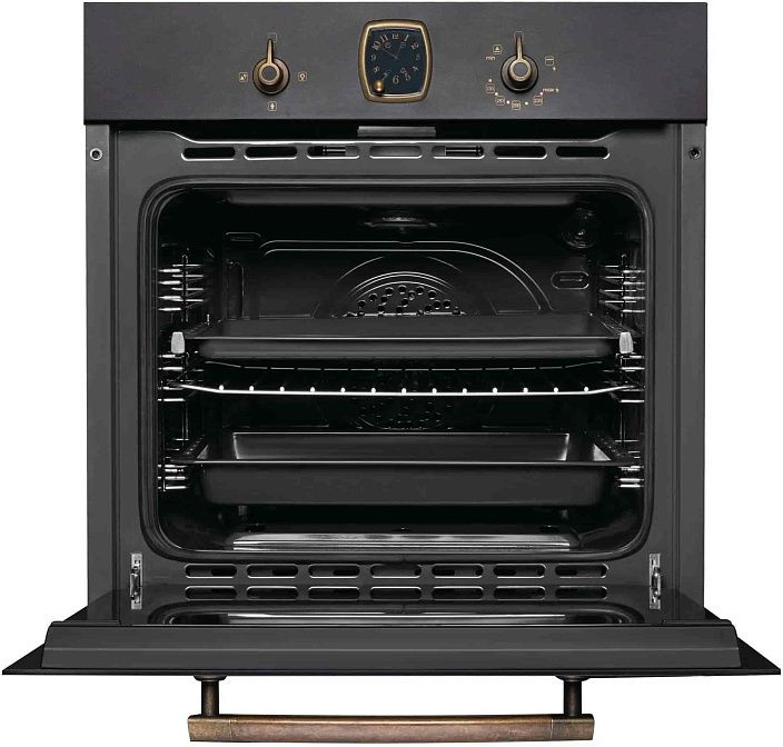 Элегантный черный корпус с бронзовой фурнитурой и алюминиевой ручкой подчеркивает сдержанный стиль и подходящую для современной кухни презентабельность. Откидная дверца с тремя стеклами сохраняет температуру и обеспечивает безопасность за счет холодной зоны, а внутренняя поверхность выполнена из пиролитической эмали и покрыта слоем легкой очистки, что упрощает уход и экономит время. Встроенные аналоговые часы в классическом стиле Frank Muller и LED-дисплей создают гармонию между традицией и технологичностью, при этом утапливаемые поворотные регуляторы поддерживают механическое управление без лишних визуальных деталей.