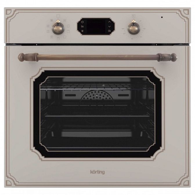 Элегантный корпус в бежевом тоне с фронтом из стекла и бронзовой фурнитурой задает премиальный акцент любой кухне. Корпус выполнен из стали, обеспечивает прочность и устойчивость к механическим воздействиям, а встроенная ручка выполнена в скрытом исполнении для сдержанного, современного силуэта. Панель управления расположена сбоку и сочетает в себе электронный дисплей и механический поворотный программатор, что делает настройку интуитивной и оперативной: есть цифровой индикатор текущей температуры и индикация режима работы. Внутреннее освещение — галогенное, позволяет контролировать процесс приготовления без частого открывания дверцы, а холодная дверь и тангенциальное охлаждение минимизируют нагрев фасада при высокой температуре внутри.