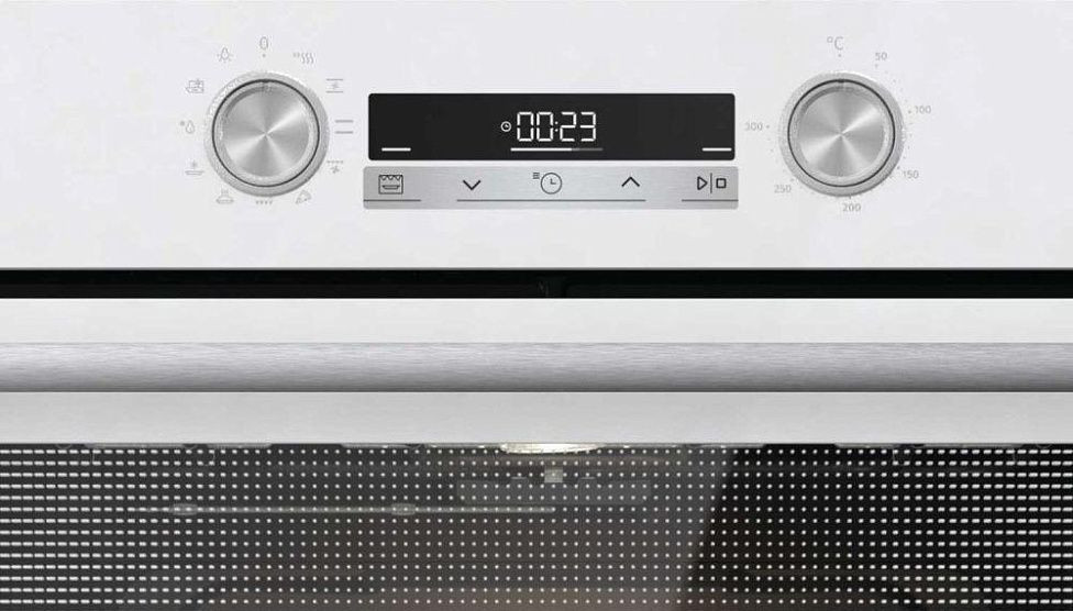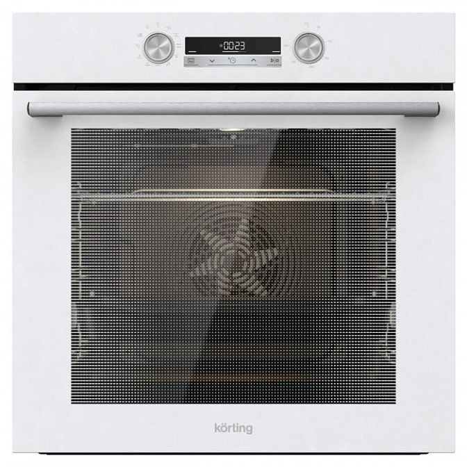 Элегантный белый корпус с фронтальной стеклянной панелью и ручкой из нержавеющей стали делает этот прибор выразительным элементом любой кухни. Продуманная компоновка сочетает современный электронный интерфейс с утапливаемыми поворотными регуляторами из прочного полиамида: сенсорная панель и информативный дисплей обеспечивают удобство управления и наглядную индикацию режима и текущей температуры. Строгие линии фасада плавно переходят в просторную камеру объемом 77 литров, рассчитанную на большие порции и многоуровневое размещение противней; ниша для встраивания 590x560x550 мм и стандартные габариты 595x595x564 мм гарантируют совместимость с большинством кухонных модулей.