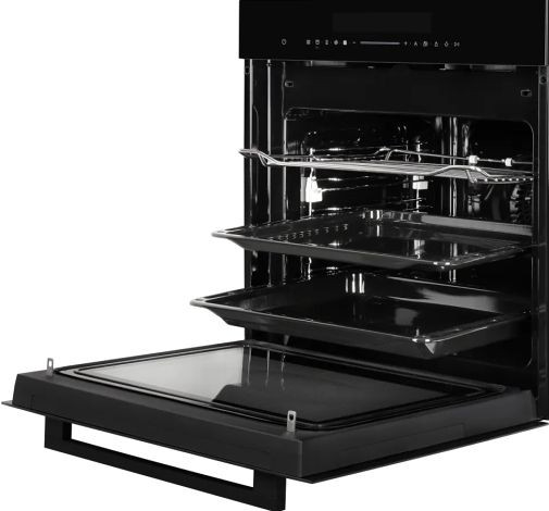 Элегантный фронт из закаленного стекла в черном исполнении придает прибору современный и строгий облик, который легко впишется в интерьер любой кухни. Компактный, но вместительный объем камеры 72 л обеспечивает простор для крупных форм и нескольких уровней выпечки: до пяти уровней приготовления с удобным размещением противней на хромированных направляющих. Ручка дверцы выполнена в бронзовом оттенке, а стеклянная фронтальная поверхность сохраняет стиль и удобна в уходе; внутренняя поверхность покрыта эмалью легкой очистки CrystalClean, что сокращает время обслуживания.