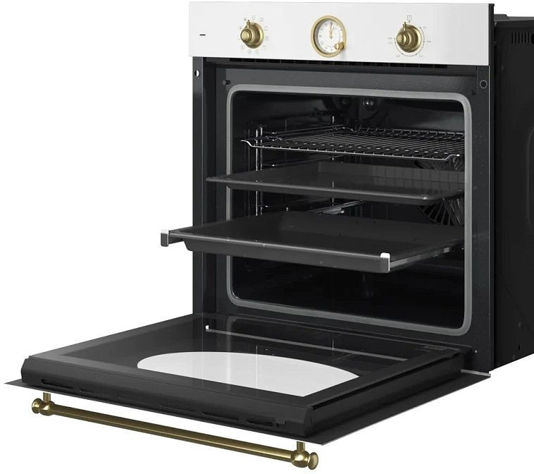 В комплектацию духового шкафа входят решетка и два противня — эмалированный и универсальный. Объем духовки составляет 80 литров, что позволяет готовить большое количество еды одновременно. В духовом шкафу предусмотрены различные режимы работы, включая нижний и верхний нагрев, разморозку, конвекцию, гриль и быстрое приготовление.