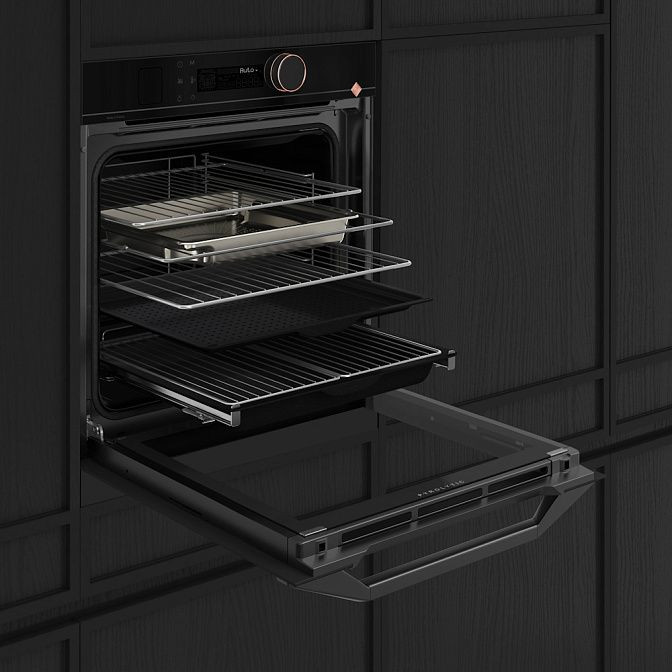 Встроенный дисплей позволяет удобно управлять всеми функциями устройства. Черный и медный цвета придают духовому шкафу современный и элегантный вид. Панель управления расположена спереди, что обеспечивает легкий доступ ко всем функциям. Устройство оснащено таймером, а также функцией распознавания наличия и размера посуды.