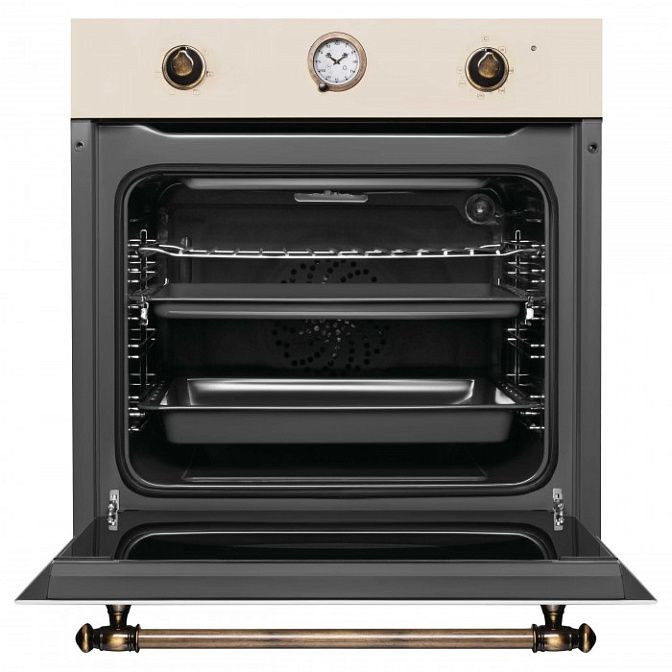 Элегантный корпус в цвете слоновая кость с фронтальной металлической панелью и бронзовой ручкой создает благородный образ, который легко впишется в кухонный интерьер в стиле Provence. Габариты 595x595x580 мм и ниша 600x560x560 мм предназначены для независимой установки, что делает прибор удобным при планировании встроенной кухни. Бронзовая фурнитура и композитные регуляторы подчеркивают премиальную отделку и придают устройству завершенный вид.