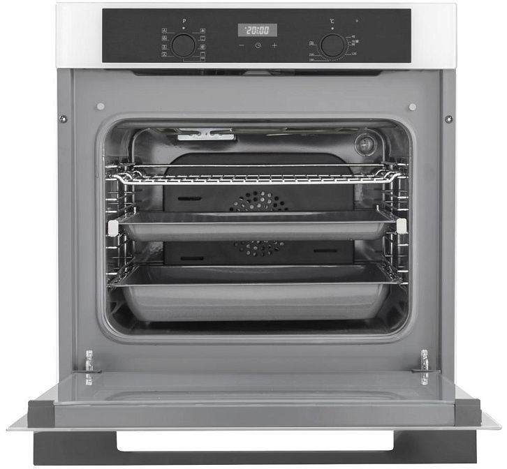 Элегантный корпус в белом цвете с фронтальной стеклянной поверхностью и черной ручкой придает кухонному ансамблю аккуратный и современный облик, а продуманная глубина и стандартные габариты 595x595x587 мм позволяют вписать прибор в нишу размером 600x560x550 мм без лишних переделок. Откидная дверца с холодным внешним стеклом и съемным внутренним полотном обеспечивает комфорт при обслуживании и безопасность при эксплуатации, а встроенные часы и LED дисплей делают управление интуитивно понятным. Материалы регуляторов — полиамид и металл — обеспечивают долговечность кнопок и стильный контраст на фасаде; утапливаемые сенсорные переключатели и сенсорное управление дисплеем подчеркивают современную концепцию управления и упрощают настройку параметров.