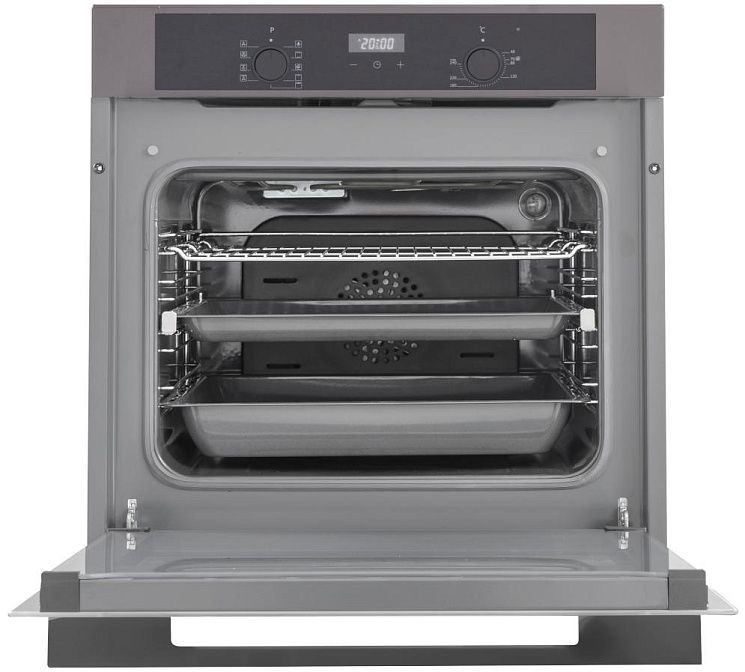 Управление организовано при помощи LED дисплея с сенсорными элементами и утапливаемых поворотных регуляторов из полиамида и металла, что обеспечивает удобство настройки и долговечность. Программатор с таймером предлагает отложенный старт и функцию автоматического отключения, а встроенные часы делают контроль времени интуитивно понятным. Телескопические направляющие на первом уровне упрощают извлечение противней, а количество уровней приготовления равно пяти, позволяя готовить разнообразные блюда одновременно.