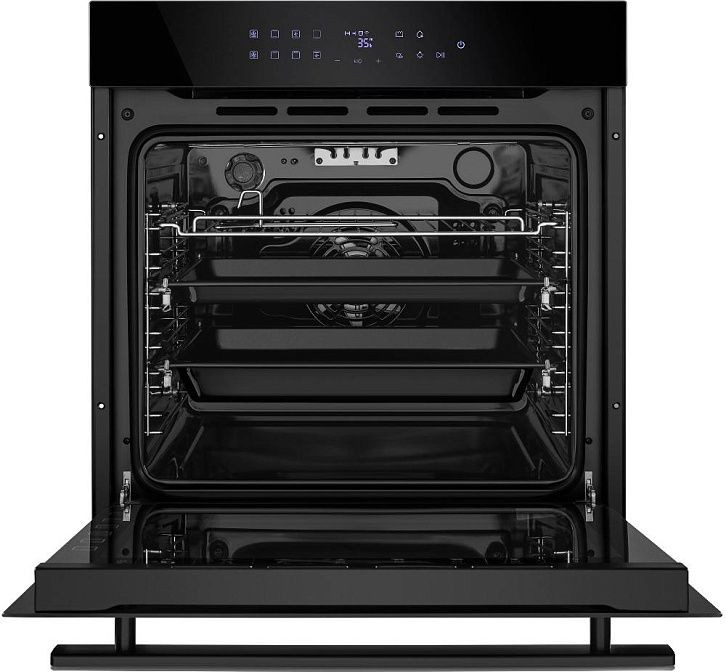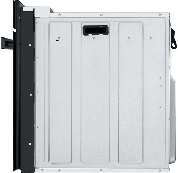 Современный бытовой прибор в черном корпусе сочетает стильную фасадную панель из стекла с металлическими деталями и минималистичной рукояткой из металла, обеспечивая аккуратный внешний вид для любой кухни. Компактные габариты (547x595x595 мм) и глубина ниши 600x564x560 мм позволяют разместить модель независимо, сохраняя пространство и удобство доступа. Передняя часть оснащена LCD-дисплеем и сенсорными переключателями, дополненными утапливаемыми поворотными регуляторами, что делает управление интуитивным: выбор режима, установка времени и контроль температуры выполняются быстро и точно. Внутренняя камера большого объема (76 л) покрыта _ko-эмалью легкой очистки, которая минимизирует пригар и облегчает уход; сплошное внутреннее стекло дверцы также снабжено легкоочищаемой поверхностью, а конструкция с тремя стеклами и съемной дверцей повышает теплоизоляцию и безопасность.