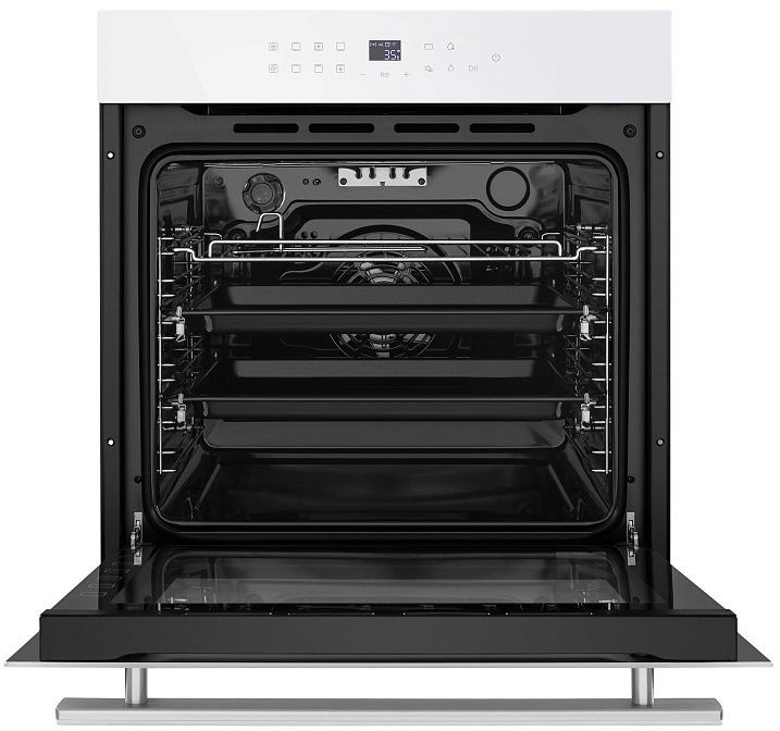 Современный встроенный белый духовой шкаф выполнен в лаконичном стиле: металлический корпус с оформлением стеклом создает аккуратный визуальный акцент, а утапливаемые поворотные регуляторы и сенсорные элементы управления гармонично сочетают удобство с минимализмом. Большая объемная камера на 76 литров обеспечивает пространство для крупногабаритных блюд и многослойного запекания, при этом внутреннее покрытие из _ko-эмали и эмаль легкой очистки упрощают уход: жир и пригоревшие остатки удаляются быстрее, чем на традиционных поверхностях. Трехслойное внутреннее стекло дверцы и холодная конструкция внешней поверхности повышают безопасность при эксплуатации, а съемная дверца облегчает полноценную чистку.