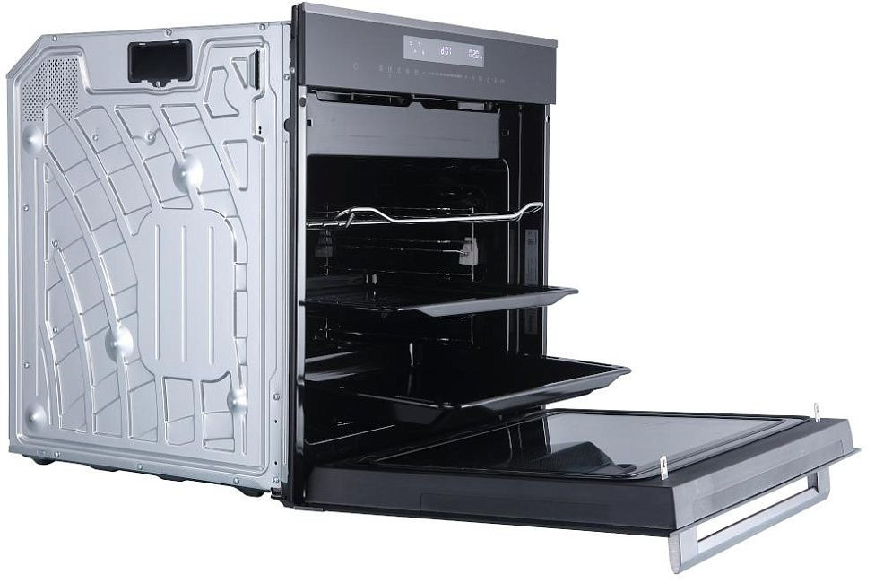 Элегантный корпус в черном цвете с фронтальной поверхностью из металла и стекла создает стильный акцент на кухне и при этом удобен в уходе. Нержавеющая ручка подчеркивает премиальность отделки, а три слоя стекла в дверце и холодная поверхность обеспечивают безопасность при эксплуатации. LED-дисплей и сенсорные переключатели вместе с утапливаемыми поворотными регуляторами дают гибкие варианты управления: можно быстро задать температуру, выбрать программу или воспользоваться отложенным стартом и таймером с отключением. Панель выглядит лаконично, обеспечивает интуитивное управление и аккуратно интегрируется в кухонный гарнитур при независимой установке.