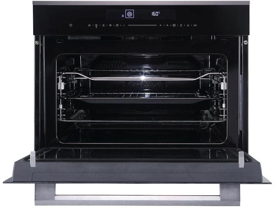 Функциональная часть построена на электрическом нагреве с принудительной конвекцией и расширенными комбинированными режимами: электрический гриль, турбо гриль, верхний и нижний нагрев, а также четыре варианта работы с микроволнами, включая интеграцию СВЧ+гриль. Быстрый предварительный прогрев и поддержание температуры экономят время и позволяют получить равномерную корочку у выпечки или хрустящую корку у пиццы. Набор из 10 базовых режимов и 16 автоматических программ упрощает подбор настроек для разных продуктов, а режимы размораживания по времени и весу гарантируют аккуратную подготовку ингредиентов. Для ценителей точного контроля доступен термощуп, таймер с отключением и отложенный старт, а индикация текущей температуры и встроенные часы облегчают планирование приготовления.
