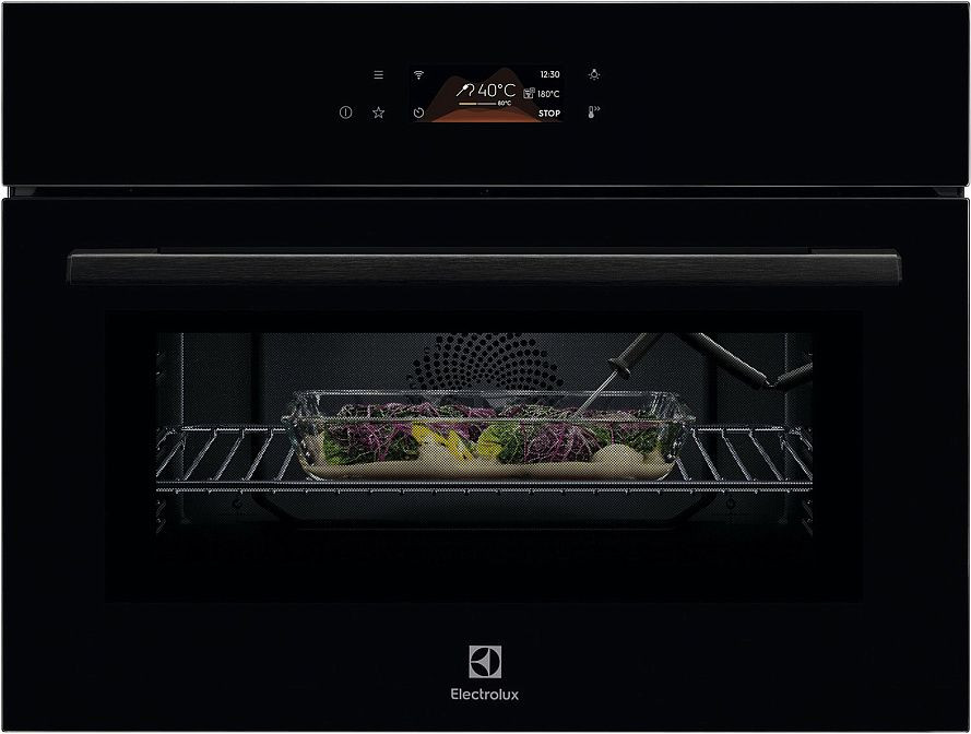Электрический тип нагрева и мощность до 3 кВт в сочетании с классом энергопотребления A обеспечивают эффективный прогрев при разумном расходе энергии. Встроенный электронный блок управления с TFT дисплеем и сенсорными переключателями делает настройку интуитивной: таймер, индикация времени до отключения, остаточного тепла, текущего режима и температуры позволяют следить за процессом без лишних действий. Наличие функции СВЧ мощностью 1000 Вт добавляет универсальности: можно сочетать микроволны с конвекцией или грилем, сокращая время приготовления и облегчая разогрев. Гриль электрический мощностью 2000 Вт даёт золотистую корочку, а термощуп позволяет точно контролировать степень готовности крупных кусков.