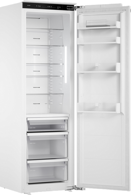 Элегантный встраиваемый агрегат в белом корпусе сочетает строгие линии и продуманную эргономику, позволяя органично вписаться в любой кухонный гарнитур. Высокая дверь с возможностью перевешивания облегчает монтаж и эксплуатацию, а компактные внешние габариты (185x59x59 см) и точные размеры 1772x557x545 мм делают модель удобной для установки даже в ограниченном пространстве. Декоративная минималистичная панель с LED дисплеем и сенсорным управлением расположена на корпусе, что обеспечивает быстрый доступ к настройкам и информативную индикацию текущей температуры.