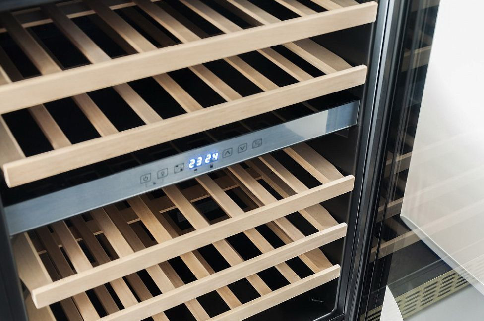 - Пять деревянных полок и двухтемпературный режим дают гибкие возможности хранения для различных сортов вин и напитков.