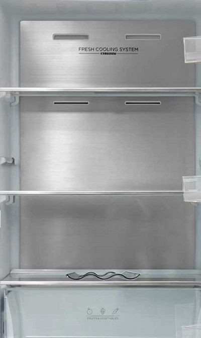 Внутреннее пространство организовано так, чтобы сочетать вместительность и гибкость: несколько выдвижных стеклянных полок коричневого оттенка, выдвижной лоток для льда, пластиковый держатель для бутылок и подставка для яиц обеспечивают аккуратное хранение. Двойная система охлаждения с инверторным компрессором и холодоагентом R600A поддерживает две независимые температурные зоны, позволяя задавать режимы для верхнего и нижнего отделений; диапазон регулировки температуры от +5 до +18 °C подходит для хранения широкого ассортимента продуктов. Полная система No Frost в обеих камерах исключает необходимость ручного размораживания, а интенсивные режимы Super Freeze и Super Cool позволяют быстро замораживать и охладить свежие запасы.