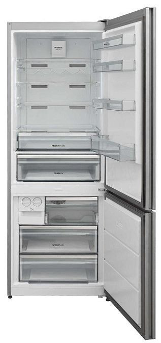 Современный двухкамерный агрегат с морозильной камерой внизу объединяет практичный дизайн и технологии для комфортного хранения продуктов. Элегантный фронт из стекла и белый металлический корпус смотрятся стильно в интерьерe в стиле Hi-Tech, скрытые ручки подчеркивают минимализм, а встроенный дисплей и сенсорное электронное управление расположены внутри камеры для удобного доступа и аккуратного внешнего вида. Просторная холодильная часть объемом 333 литра оснащена стеклянными полками, регулируемыми направляющими и большим ящиком XXL Space box, что обеспечивает грамотную организацию пространства; зона свежести с возможностью регулировки влажности и температуры представлена универсальной секцией, подходящей для овощей, фруктов или деликатных продуктов. Морозильный блок полезным объемом 128 литров работает по системе Full No Frost, поддерживая сухую и эффективную заморозку без образования льда и инея, а функция суперзаморозки быстро фиксирует свежесть и структуру продуктов при интенсивной загрузке.