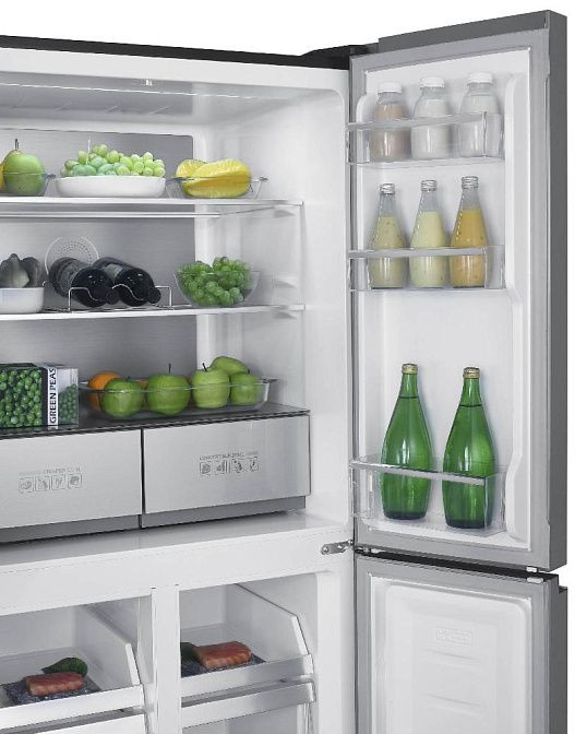 Продуманная внутренняя организация объединяет три камеры и четыре двери, предлагая общий полезный объем 466 литров: холодильная часть на 291 литр и морозильная секция объемом 175 литров, размещенную снизу. Наличие двух независимых температурных зон с отдельной регулировкой и диапазонами от +5 до +18 °C делает модель идеальной для хранения овощей, сыров и напитков в оптимальном режиме; зона свежести обеспечивает длительное сохранение качества продуктов. Для хранения бутылок предусмотрена металлическая полка и отсек, общая вместимость достигает 56 единиц, а специальная наклонная деревянная полка под углом 45° эффектно демонстрирует выбранные этикетки. Внутри доступны стеклянные съемные и выдвижные полки, контейнер для воды и шесть полок на дверце, а в морозилке предусмотрены четыре выдвижных ящика и две полки для удобного распределения замороженных продуктов.