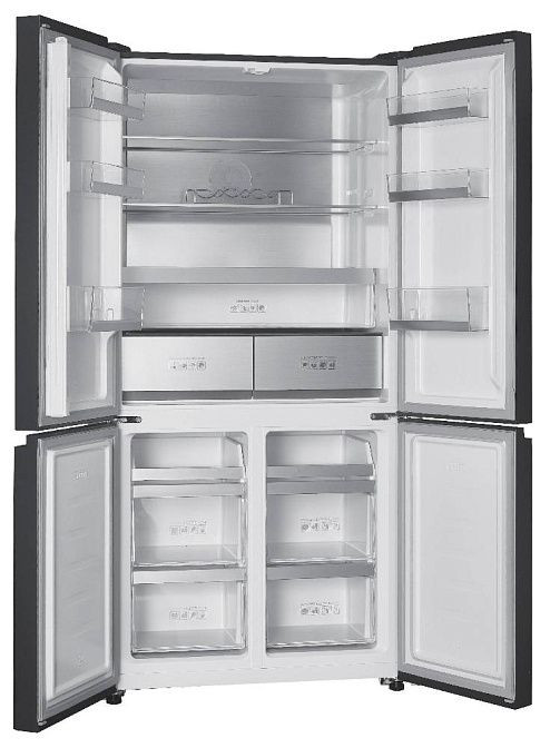 Внутренняя организация рассчитана на продуманное хранение: общий полезный объем 512 литров распределен между тремя камерами — холодильной с 364 л и морозильной с 148 л, дополнена зоной свежести. Наличие двух независимых температурных зон и двойной системы охлаждения с инверторным компрессором и хладагентом R600A обеспечивает стабильное поддержание параметров и препятствует смешению запахов. Полки из стекла, в том числе выдвижные и съемные, коричневого цвета и одна деревянная полка под углом 45° для демонстрации, вместе с 6 внутренними полками на дверце и 4 выдвижными лотками в морозильной части гарантируют удобство укладки. Для любителей напитков предусмотрена откидная металлическая подставка для бутылок и общая вместимость до 56 бутылок, а контейнер для воды и ледяной лоток дополняют функционал.
