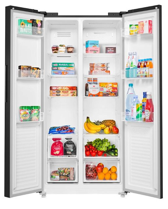 Этот вместительный Side-by-Side в черном исполнении объединяет элегантный стеклянный фронт и надежный металлический корпус со стальными боковинами, создавая современный и цельный образ для кухни. Модель выполнена в формате с морозильной камерой справа или слева, имеет два дверных полотна и полноразмерную цилиндрическую ручку, что обеспечивает удобство доступа при любом варианте расположения. Прямая установка с жестким креплением door on door позволяет монтировать прибор вплотную к стене, а регулируемые ножки дают возможность точной подгонки по уровню, при этом габариты 177x91,2x70,4 см делают аппарат заметным, но гармоничным элементом интерьера.