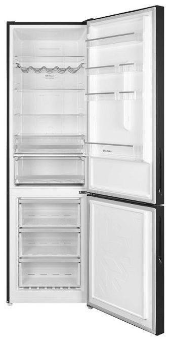 Элегантный черный корпус с металлическими дверцами и боковыми панелями формирует современный и строгий образ, который органично впишется в интерьер кухни в стиле минимализм или хай-тек. Высота 200 см и стандартная ширина около 60 см позволяют установить прибор отдельно стоящим или встроить в нишу с размерами 194—195x56—57x56 см; конструкция предусматривает перенавешивание дверей и скользящее крепление для удобства монтажа. Ручки из металла имеют темный оттенок и выполнены в скрытом дизайне, что добавляет аккуратности и упрощает уход, а замок обеспечивает дополнительную безопасность для семьи или бизнеса. Внутренняя планировка продумана для рационального размещения продуктов: четыре выдвижные стеклянные полки бежевого цвета с регулировкой высоты, шесть держателей на дверце, площадка для бутылок и подставка для яиц дают простор для организации пространства, а большой ящик и два контейнера для овощей и фруктов сохраняют свежесть за счет регулируемой влажности в зоне свежести.