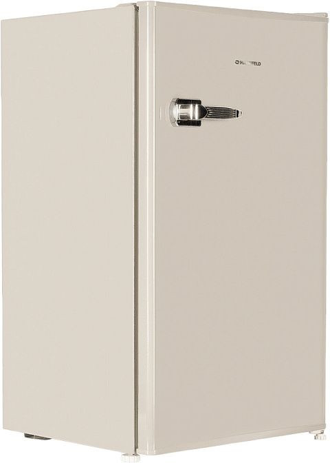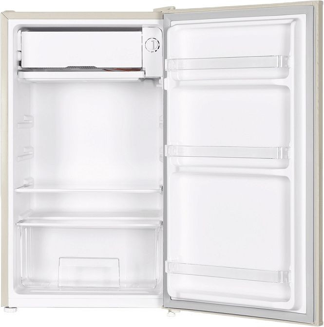 Холодильник выполнен в бежевом цвете, что делает его универсальным для любого интерьера. Корпус из металла обеспечивает долговечность и надежность. Внутри холодильника имеется две полки из стекла в рамке, которые можно легко очищать.