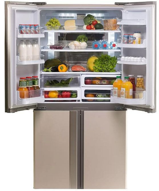 Современный агрегат выполнен в стильной бежевой гамме с абсолютно ровной глянцевой фронтальной панелью и стальными боковыми стенками, что делает его выразительным акцентом для просторной кухни. Конструкция в стиле Side-by-Side с четырьмя дверцами и встроенными вертикальными ручками сохраняет лаконичность фасада, при этом система door sliding обеспечивает плавное и компактное крепление полотен, позволяющее размещать корпус близко к стене. Продуманная геометрия корпуса (183x89.2x77.1 см) сочетается с возможностью частичной встраиваемости и регулируемыми ножками, упрощая монтаж и создавая аккуратный внешний вид.