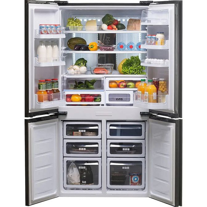 Элегантный корпус в черном стекле и стальных панелях сочетает винтажный характер и современную функциональность: дизайн в стиле 50-х годов подчеркнут скрытыми встроенными ручками и серебристой фурнитурой, а жесткое крепление двери по системе door on door и FrenchDoor позволяют монтировать прибор вплотную к поверхности без потери комфорта. Продуманная фронтальная панель с сенсорным дисплеем на дверце удобно отображает температуру морозильной и холодильной камер, состояние открытой двери и индикацию отключения питания, а скрытая подсветка светодиодами обеспечивает равномерное освещение внутреннего пространства. Компоновка трех камер и четырех дверей организована так, чтобы обеспечить удобный доступ к основным зонам хранения: просторная холодильная секция с полками из закаленного стекла и зоной свежести на 45 л сохраняет продукты в оптимальных условиях благодаря регулировке влажности, отдельный ящик на телескопических направляющих облегчает работу с овощами и фруктами, а дополнительные полки и семь отсеков на дверце позволяют разместить бутылки, консервы и мелкие упаковки. Морозильный блок внизу оснащен несколькими ящиками и системой No Frost, что исключает образование льда и избавляет от необходимости ручной разморозки; ускоренная функция суперзаморозки и режим суперохлаждения помогут быстро зафиксировать температуру при закладке больших партий продуктов, а мощность замораживания до 9,5 кг/сутки гарантирует эффективность. Технология Plasmacluster и уникальная гибридная система охлаждения вместе с дезодоратором снижают неприятные запахи и препятствуют распространению микрочастиц, сохраняя свежесть без лишней влаги, тогда как динамическая система распределения потока воздуха обеспечивает равномерный климат по всем полкам. Управление сенсорное, с поворотным регулятором и цифровой панелью, регулировка температур доступна и в морозильной, и в холодильной секции, при этом функция автоматического льдогенератора удобна для быстрого получения кубиков льда без подключения к водопроводу. Прибор спроектирован с учетом безопасности и удобства: сигнализация открытой двери и звуковая индикация неисправности, защита от детей, регулируемые ножки, возможность установки в нишу (820-890x600x550 мм) и автономное сохранение холода до 17 часов. Технические параметры отражают экономичность и надежность: класс энергопотребления A, годовой расход около 156 кВт·ч, уровень шума 37 дБ и длина шнура 3 м; инверторный компрессор с одним контуром обеспечивает стабильную работу и меньший расход энергии. В комплекте идут подставка для яиц и документация, гарантия производства 12 месяцев, страна изготовления Таиланд; материал полок и ящиков — прочное закаленное стекло, корпус выполнен из металла и стекла, что подчеркивает премиальный внешний вид и долговечность.