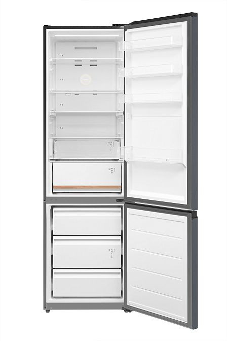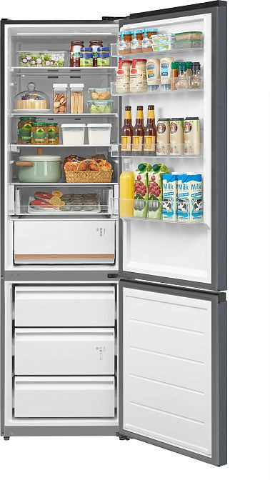 Внутреннее наполнение продумано для удобного хранения: четыре стеклянные полки выдерживают габаритные емкости, дополнительные полки на дверце помогают распределить напитки и соусы, а три выдвижных ящика в морозильной части упрощают сортировку замороженных продуктов. Объемы впечатляют: 324 л холодильной зоны и 154 л морозильной секции суммарно дают 478 литров полезного пространства, в том числе универсальная зона свежести на 113 л с возможностью регулировки влажности, что позволяет подолгу сохранять текстуру и вкус фруктов, овощей и мяса.