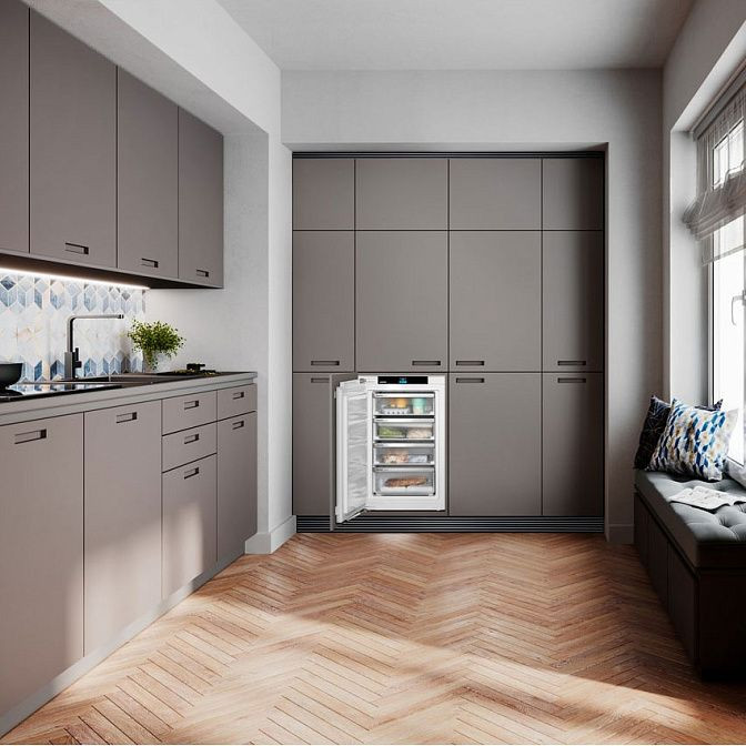 Особенностью этого морозильника является его встраиваемый тип установки. Это позволяет экономить пространство на кухне, а также создает гармоничный и цельный образ интерьера. Дверной упор расположен справа, что обеспечивает удобство использования. Морозильник оборудован инверторным компрессором и системой охлаждения на основе хладагента R600A. Благодаря этому, он обеспечивает быстрое и эффективное охлаждение продуктов.