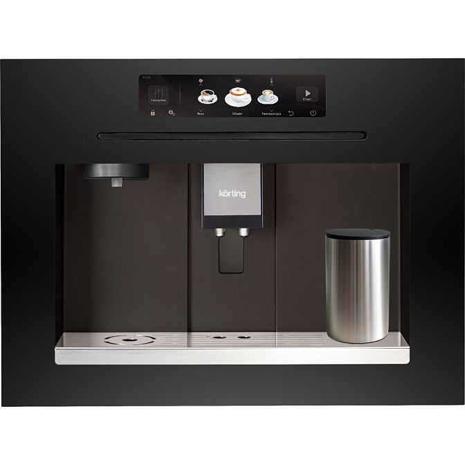 Сдержанный графитовый корпус в духе модерн делает эту встраиваемую модель не просто функциональным прибором, а стильным элементом кухонного гарнитура. Комбинация металла и пластика обеспечивает прочность при аккуратном внешнем виде, а сенсорное управление с дисплеем и дисковый SMART джойстик дают интуитивный доступ ко всем опциям. Конструкция рассчитана на встраивание в нишу 452x568x550 мм, при этом габариты 45.5x59.5x40.5 см и глубина корпуса 43.3 см позволяют легко интегрировать аппарат в мебель с учетом выдвижного отсека для кабеля и расположения резервуара сзади.
