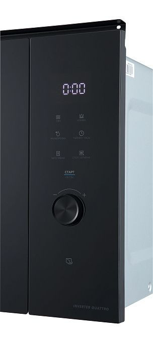Встроенный прибор выполнен в сдержанном черном облике с фронтальной металлической панелью и нержавеющей внутренней камерой, что придает кухонному ансамблю современный Hi_Tech акцент. Корпус рассчитан на установку в нишу 380x560x550 мм при стандартной ширине встраивания 56 см; внешние габариты позволяют сохранить ровные линии шкафов без лишних выступов. Откидная дверца с кнопкой и трёхслойным стеклом обеспечивает комфорт при загрузке и защиту от интенсивного нагрева, а встроенная подсветка облегчает визуальный контроль за процессом приготовления внутри объема духовки 72 л и отдельной СВЧ_камеры 25 л.