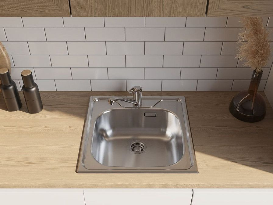 Модель представляет собой квадратную накладную мойку с одной основной и одной дополнительной чашей. Глубина основной чаши составляет 180 мм, а дополнительной — 200 мм. Размеры чаш позволяют удобно разместить посуду различного размера, обеспечивая комфорт и удобство при использовании.