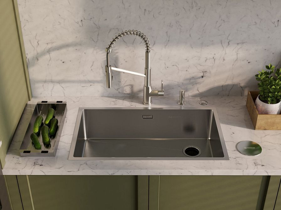 Рабочая чаша размером 700x400x200 мм рассчитана на интенсивное использование: вмещает противни 45x35 см, кастрюли до 6 литров, высокие бокалы и формы для выпечки. Лучи-направляющие на горизонтальном дне ускоряют слив воды на 40%, исключая лужи и застой. NANO-покрытие активно отталкивает воду, жиры, пигменты — капли скатываются самостоятельно. Выпускной клапан диаметром 90 мм расположен сбоку, освобождая центральную зону для измельчителя или системы хранения. Полная герметичность швов гарантирована вакуумной сваркой.