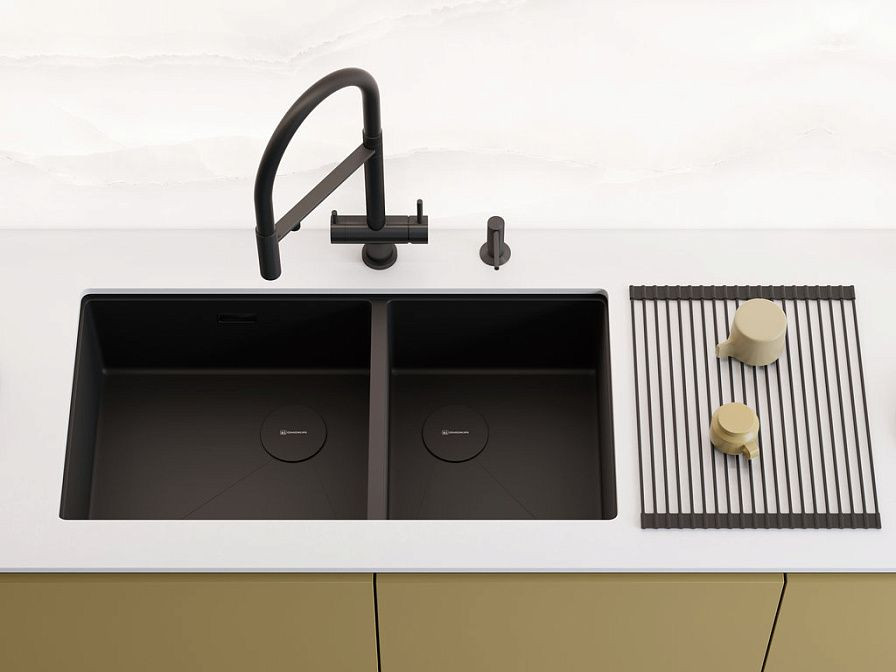 Большая левая чаша для крупной посуды, правая — для мелочей. Глубина 200 мм обеспечивает комфорт. Система IN-SIDE исключает видимые стыки со столешницей. Сливы 90 мм с креплением.