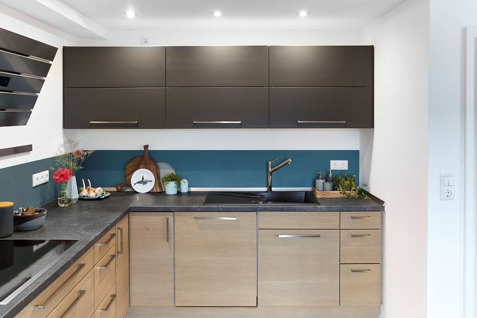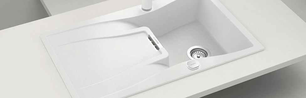 Форма мойки прямоугольная, что обеспечивает максимальное использование пространства. Размеры чаши составляют 354x435 мм, а глубина основной чаши — 184 мм, что позволяет легко поместить в ней большие кастрюли и сковороды. Материал столешницы мойки также искусственный камень, что обеспечивает ей дополнительную прочность и долговечность.