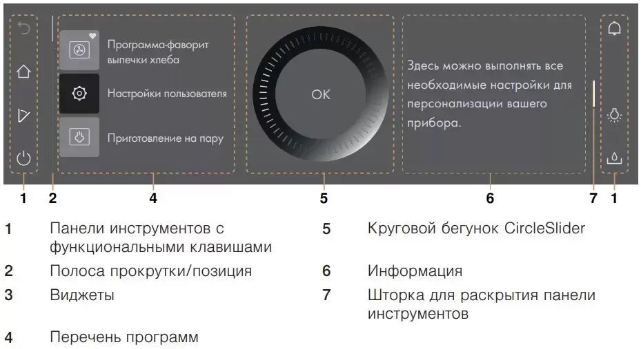 Управление реализовано через полноцветный графический дисплей с сенсорным экраном и CircleSlider, дополненное пневматической кнопкой и сенсорными переключателями: комбинация дает быстрый доступ к настройкам и интуитивную навигацию среди программ. На экран выводятся индикация текущего времени, фактической температуры и заданной величины, при этом предусмотрена индикация уровня воды в резервуаре и автоматическое отключение при закипании или достижении требуемого режима. Встроенный трёхточечный температурный зонд позволяет контролировать степень готовности, а функция су-вид и многочисленные предустановки расширяют возможности для деликатного приготовления.