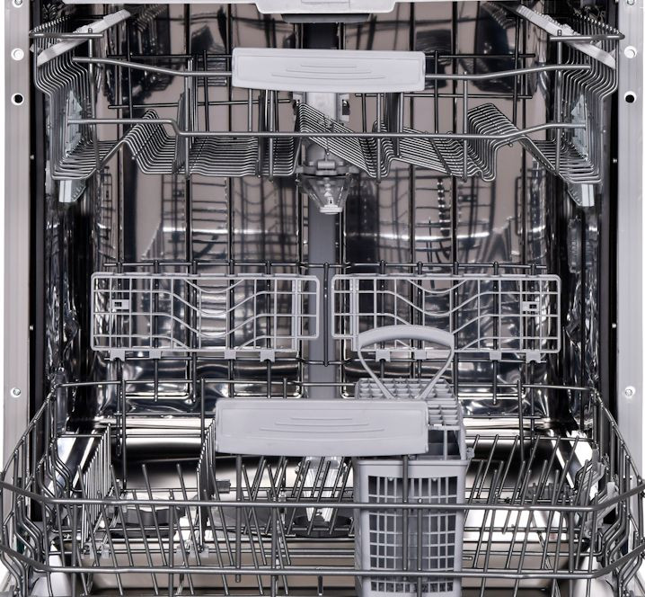- Удобная полная встраиваемая конструкция с нержавеющим фасадом и тремя регулируемыми корзинами для разных наборов посуды.