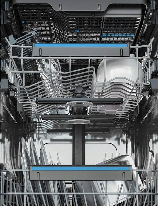Машина оснащена несколькими режимами работы, включая подогрев посуды, программы приготовления теста и программу размораживания. В зависимости от выбора продукта, машину можно настроить на сухой или влажный режим. Индикация на машине представлена лучом на полу, указывающим на окончание цикла работы, а также индикаторами наличия ополаскивателя и соли.