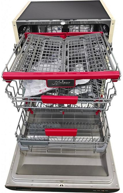 - Вместительная конструкция на 14 комплектов с тремя корзинами и третьим уровнем для оптимальной укладки разнообразной посуды.