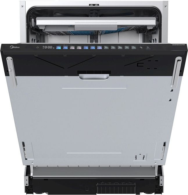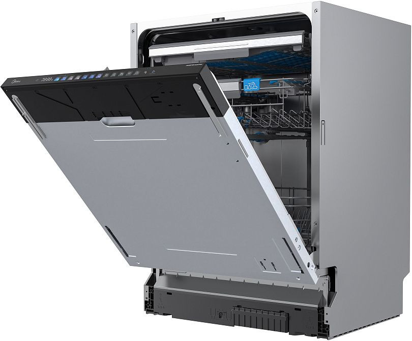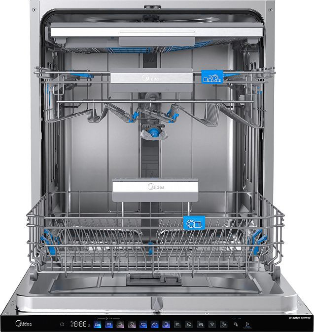 Внутренняя отделка выполнена из нержавеющей стали, устойчивой к коррозии и воздействию высоких температур, что особенно важно при регулярных циклах с горячей водой. Гладкие стенки камеры не впитывают запахи, легко моются и долго сохраняют презентабельный вид даже при активной эксплуатации. Внутреннее пространство организовано продуманно: три уровня загрузки, включая третий верхний поддон для столовых приборов и мелких аксессуаров, обеспечивают вместимость до 14 комплектов посуды и дают гибкость при формировании ярусов. Верхняя корзина регулируется по высоте системой Easy Lift, поэтому при необходимости можно освободить место для крупной посуды, высоких бокалов или вместительных кастрюль на среднем уровне.