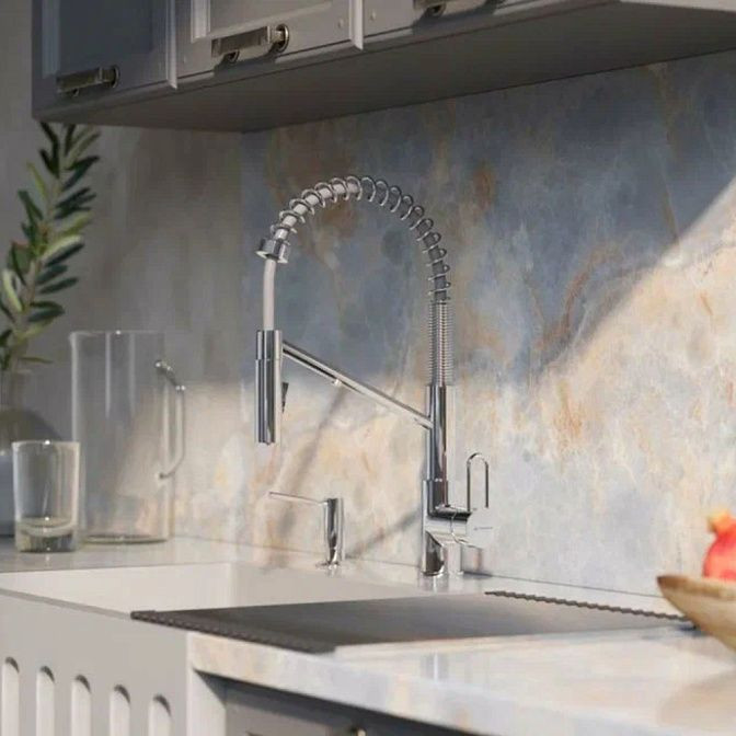 Смеситель имеет вытяжной шланг, что значительно упрощает процесс мытья посуды и очистки раковины. Установка смесителя осуществляется врезным способом, благодаря чему он надежно фиксируется и не провоцирует утечку воды. Покрытие PVD придает изделию дополнительную прочность и защищает его от коррозии и механических повреждений.