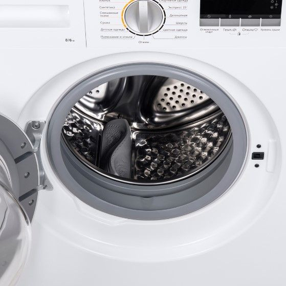 Удобство эксплуатации обеспечивают просторная загрузка до 8 кг для стирки и до 6 кг для сушки, инверторный мотор и система Easy Logic для интеллектуального подбора параметров. Модель предлагает 16 режимов стирки, включая режимы для хлопка, смешанных тканей, деликатной ручной стирки, шерсти, детских вещей, джинсов и спортивной экипировки, а также экспресс и интенсивные циклы. Для экономии времени предусмотрены быстрые опции и дополнительные программы: 1 час стирки с сушкой, отжим, полоскание с отжимом, хлопок эко и стандартный цикл. Контроль пенообразования, защита от протечек и дополнительное полоскание повышают безопасность и качество обработки.