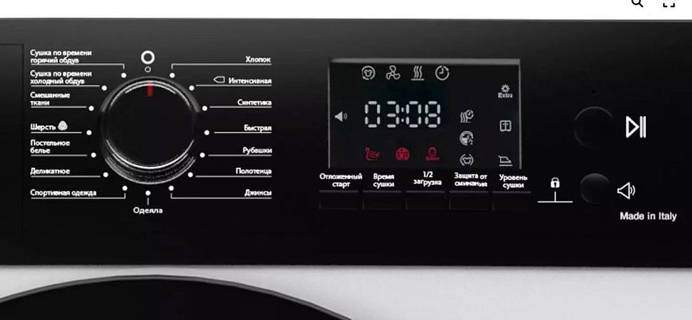 Управление предлагает гибкость: электронная панель с памятью пользовательских настроек, таймер отсрочки старта от 1 до 24 часов, звуковой сигнал окончания и функция отключения звуковых оповещений. Безопасность обеспечивает детская блокировка, электромагнитный замок, ворсовый фильтр и автоматическая блокировка дверцы во время цикла. Конструкция допускает установку в колонну и side-by-side, а компактные габариты 85x59,6x63,6 см и глубина с открытой дверцей 105,4 см учитывают ограниченное пространство при монтаже. Итальянская сборка гарантирует качество, а двухлетняя гарантия обеспечивает уверенность при эксплуатации.