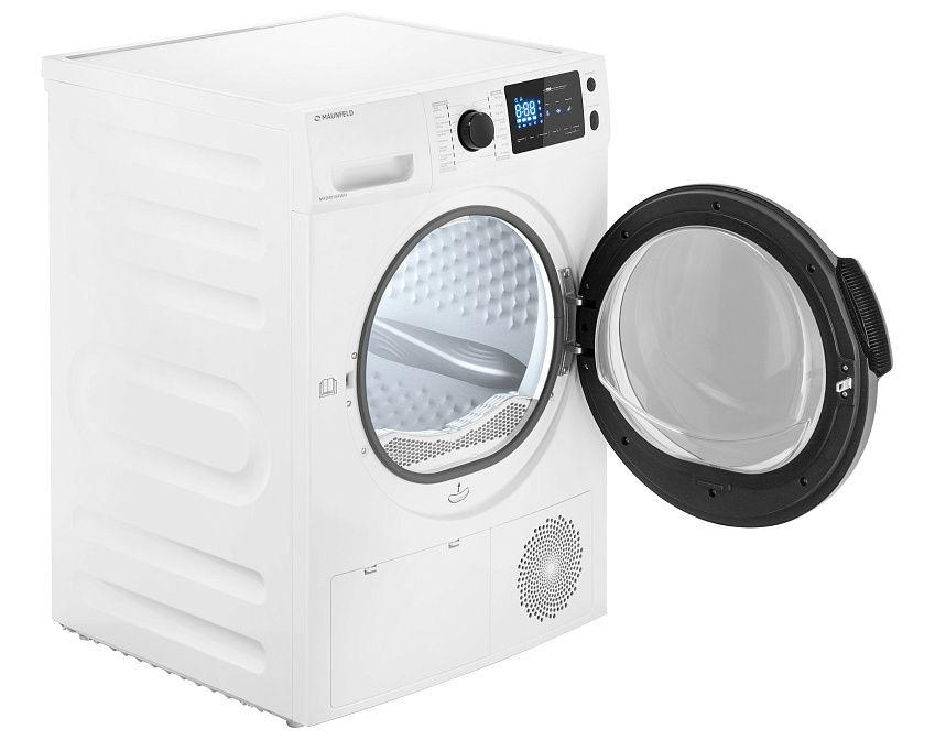 Выглядит современно и сдержанно: вертикальные пропорции 85x60x65,5 см, чистый белый цвет корпуса и белая дверца люка с прямоугольной формой подчеркивают минималистичную эстетику. Передняя панель выполнена из акрилового стекла, цвет панели управления — черный, а LED дисплей информирует о времени до окончания выбранной программы. Конструкция с поворотными регуляторами и сенсорными кнопками обеспечивает интуитивное управление, а наличие кнопок специальных функций позволяет сохранить любимые настройки в память (MyFavourite). Угол открытия дверцы до 180° и внутренняя подсветка барабана из нержавеющей стали повышают удобство загрузки и выгрузки, диаметр люка 37,5 см обеспечивает доступ даже для объемных предметов, а барабан Soft Drum бережно относится к тканям.