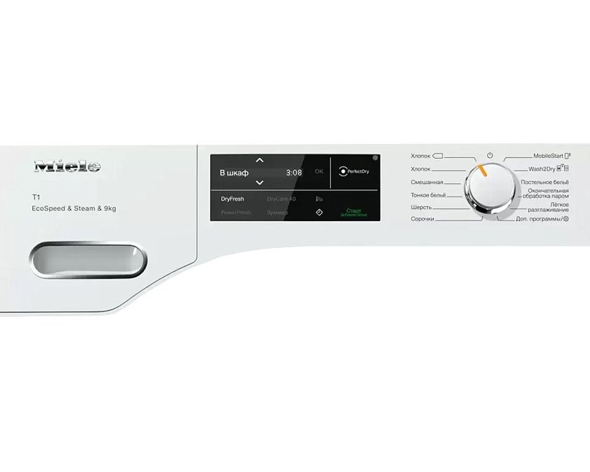 Устройство также оснащено системой Miele@Home, которая позволяет управлять им через Wi-Fi. Функция EcoFeedback помогает контролировать энергопотребление, а функция AddLoad позволяет добавлять белье во время сушки. Система PowerWash обеспечивает эффективную стирку и сушку, а функция SteamFinish помогает разгладить складки на белье.