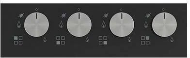 Управление механическое, с поворотными металлическими регуляторами, расположенными спереди для комфортного доступа; предусмотрена 9-ступенчатая регулировка мощности и функция минимального огня для точного томления. Дополнительные опции включают блокировку управления от детей и индикацию остаточного тепла, что делает эксплуатацию предсказуемой и безопасной. Для приготовления на больших сковородах в комплекте есть подставка WOK, а чугунные решетки обеспечивают надежную опору и равномерное распределение тепла.