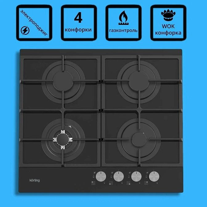 Поверхность оснащена четырьмя конфорками разного диаметра, включая специально усиленную WOK-зону и трехконтурную двойную корону для интенсивного нагрева больших кастрюль: размеры горелок — 123, 73,5, 73,5 и 53,7 мм. Мощностные показатели варьируются от 0,95 до 3,1 кВт, общая потребляемая мощность достигает 7,2 кВт (7450 Вт). Электроподжиг упрощает запуск пламени, газконтроль обеспечивает автоматическое перекрытие подачи в случае потухания, а функция автоматического отключения повышает безопасность при длительном отсутствии контроля.