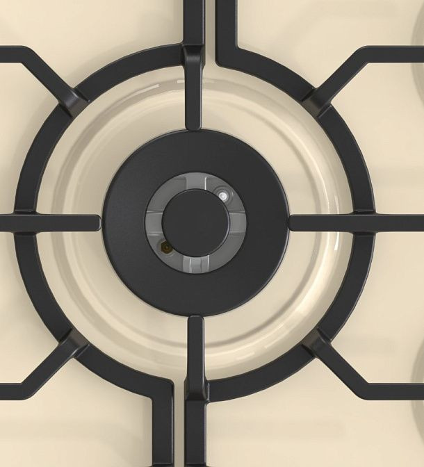 - Безрамочный стеклокерамический дизайн в цвете слоновой кости с антрацитовыми профилями и съемными чугунными решетками для простого ухода.