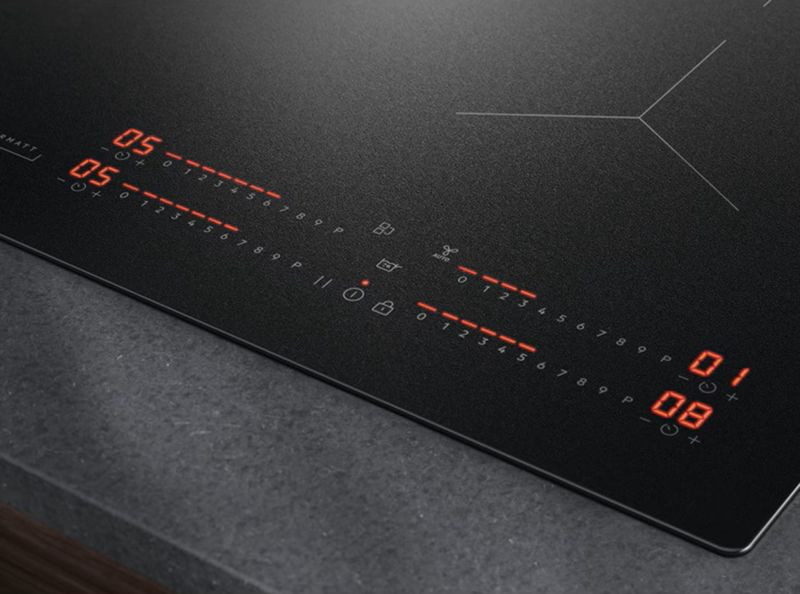 Управление полностью сенсорное с LED-дисплеем, интуитивно понятное и компактное: сенсоры реагируют на прикосновение, есть таймер с автоматическим отключением и индикация остаточного тепла для безопасной эксплуатации. Панель поддерживает функции детектирования посуды и поддержания тепла, режим автоматического закипания и Pause — кратковременную паузу в приготовлении, а также опцию индукционного моста для объединения двух зон под крупную кастрюлю или жарочную посуду. Среди интеллектуальных режимов присутствуют Hob2Hood, обеспечивающий согласованное взаимодействие с вытяжкой, и PerfectFry с пятью температурными диапазонами для точного контроля степени обжарки. Для безопасности предусмотрены блокировка от детей и автоотключение при перегреве.
