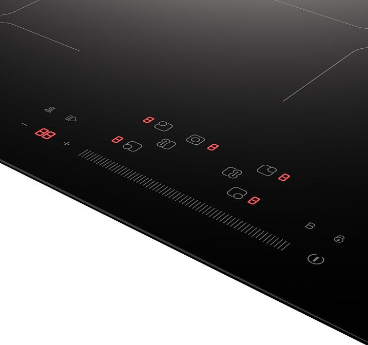 - Двухконтурная конфорка и Flex Zone позволяют работать с посудой разных размеров, включая крупные кастрюли и WOK, без потери эффективности.