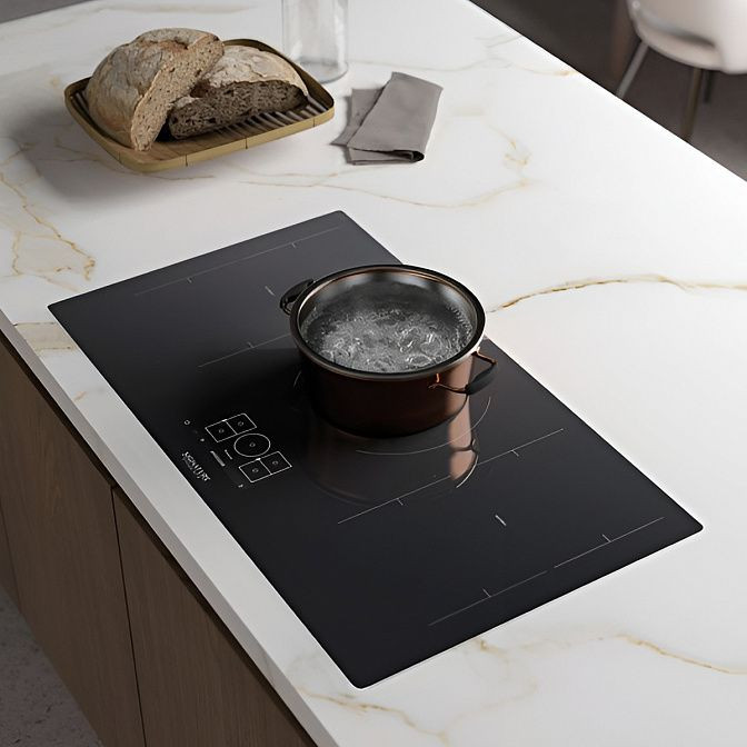 - Заподлицо установка с безрамочной стеклокерамической поверхностью и пятью сенсорными зонами придают кухне элегантность и упрощают уход.