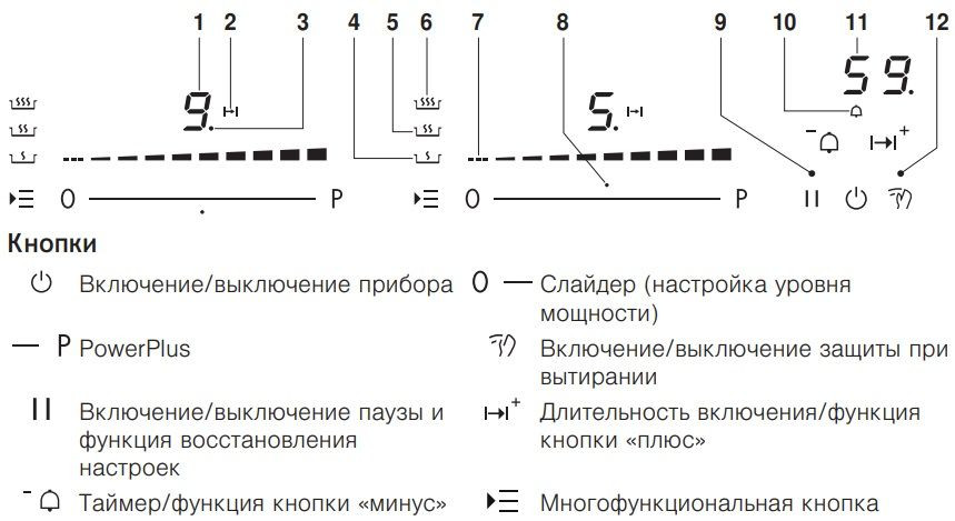 Устройство оснащено четырьмя индукционными зонами с максимальной общей нагрузкой 7,4 кВт и возможностью объединения конфорок для крупной посуды. Каждая конфорка поддерживает 9-ступенчатую регулировку мощности, а режим PowerPlus обеспечивает интенсивный кратковременный прирост тепла для быстрой подготовки блюд. Система распознавания присутствия и размера посуды автоматически определяет использованный предмет, оптимизируя энергопотребление и ускоряя нагрев. Для удобства предусмотрены функция паузы, re-Start и quickStart, а также таймер с режимом для варки яиц. Программные режимы включают автоматику закипания, поддержание заданной температуры и функцию плавления, а опция «кипение на медленном огне» позволяет аккуратно доводить блюда до готовности без риска перелива.
